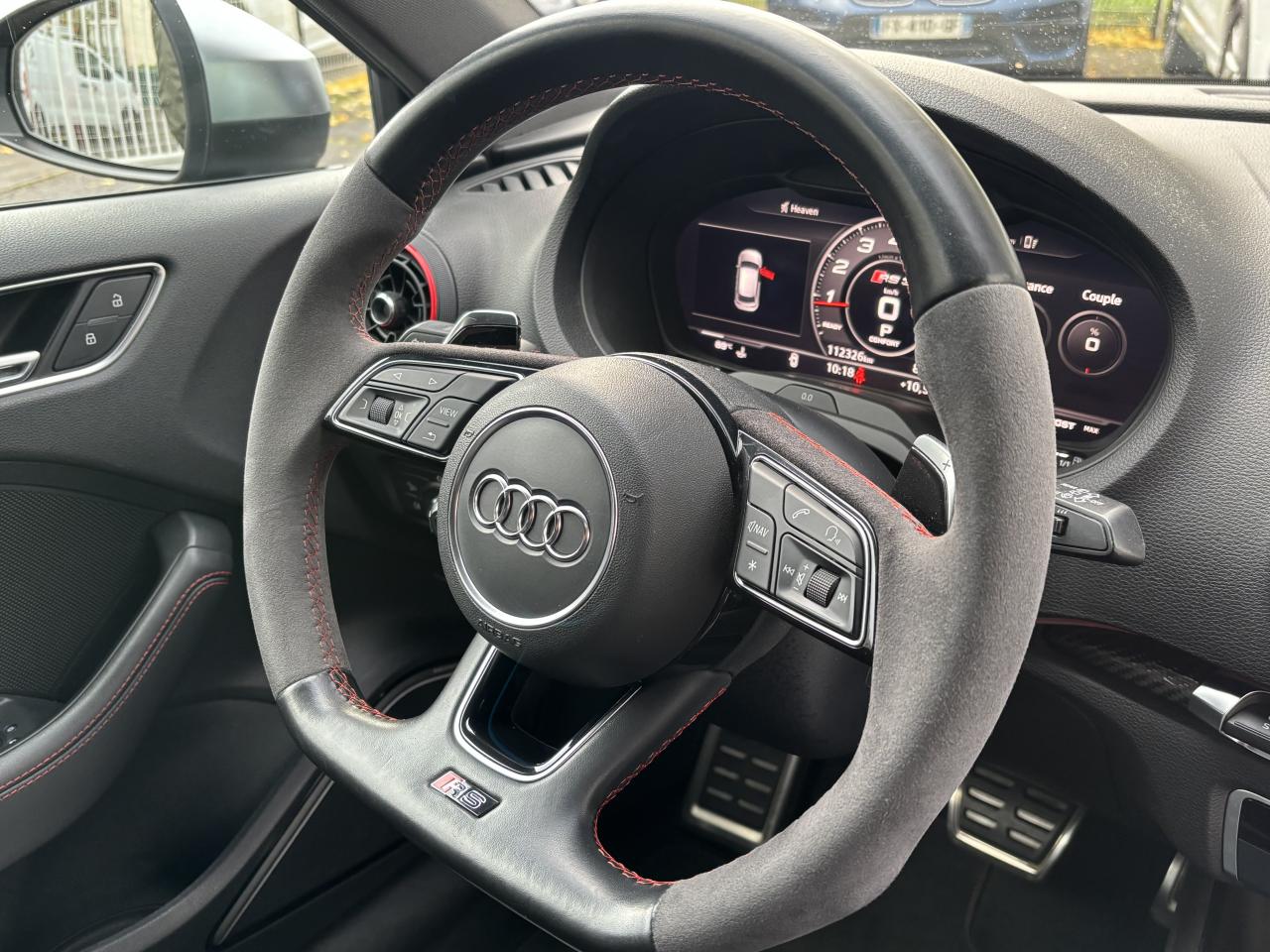 Accoudoir central avant coulissant en longueur, avec vide-poches relevable et inclinaison réglableAdvanced Key : système d'autorisation d'accès et de démarrage main libreAiles avant avec passages de roues élargisAirbag de genouxAirbags conducteur et passagerAirbags latéraux (thorax / bassin) avantAlarme antivol avec protection antiremorquage, incluant protection volumétrique de l'habitacle (non homologuée)Applications décoratives sur les contre-portes et tableau de bord style "3D gris titane"Appuie-tête intégraux à l'avant et à l'arrièreASR (antipatinage)Audi connect avec une carte SIM de données intégréeAudi Drive Select : différents réglages du véhicule à travers trois modesAudi parking system plus : signal acoustique et visuel d'aide au stationnement avant et arrière par pictogrammes sur l'écranAudi Premium Tracking SystemAudi Smartphone Interface avec AppleCarplay et AndroidAutoAudi sound system : 10 haut-parleurs incluant un haut-parleur central et un subwoofer ; amplificateur à 6 canaux avec une puissance totale de 180 wattsAudi virtual cockpit : combiné d’instruments entièrement numériques avec affichage haute résolution sur un écran de 12,3"Baguettes décoratives sur les vitres latérales style aluminium mat ; revêtement noir brillant sur les montants de pavillon centraux extérieurs et les triangles de portières arrièreBecquet arrière RS3 laqué dans la couleur de la carrosserie, au niveau du pavillon avec inserts aérodynamiques latéraux noir brillantBuses de lave-glace chauffantesCalandre Audi singleframe avec grille de calandre à structure alvéolée noir brillant et encadrement d'une seule pièce style aluminium mat ; ouvertures d'entrées d'air en noir brillantChâssis Sport RSCiel de pavillon en tissu noirClé à fréquence radio, avec emblème RSClimatisation automatique bi-zoneDétecteur de pluie et allumage automatique des projecteursDirection progressive contribuant à une augmentation de la dynamique de conduite grâce à une démultiplication directe et progressiveEcrous antivol pour les rouesExtensions de bas de caisse couleur carrosserieFeux de route assistés : gestion automatique du passage de feux de croisement à pleins phares et inversementFixation pour sièges enfants ISOFIX et Top Tether pour les places arrière extérieuresFrein de stationnement electromécaniqueFreins à disquesIdentification du modèle/technologie sur le capot de coffreInscriptions RS3 sur la calandre, le capot de coffre, les baguettes des seuils de portes, le volant Sport, le pommeau de levier de vitesses et le compte-toursJantes en alliage léger en style à 10 branches, ultrabrillantes, avec pneus 235/35 R19Lave-pharesMMI navigation plus avec MMI touchOutillage de bord et cricPack Aluminium extérieurPack aluminium intérieurPack EclairagePack rangement + Pack coffrePalettes de changement de rapports au volantPare-brise acoustiquePare-chocs RS : style dynamique et sportif, larges prises d'air à l'avant en noir brillant ainsi que lame horizontale laquée dans la couleur de carrosserie, diffuseur noir brillant à l'arrièrePédalier et repose-pied en acier inoxydablePeinture intégrale uniePhares intégralement à LED (full LED) avec clignotants arrière dynamiquesRégulateur et limiteur de vitesseRétroviseur intérieur électrochromeRétroviseurs extérieurs réglables, dégivrants et rabattables électriquement avec position automatique pour manoeuvre de stationnementRétroviseurs extérieurs style aluminium mat avec rappels de clignotant à diodes, asphérique côté conducteur, convexe côté passager avant, dégivrants et escamotables électriquementSécurité enfants électriqueSeuils de portes avec inserts en aluminium et emblème RS 3Sièges avant sportSystème ABS avec répartiteur électronique de freinage EBV, programme électronique de stabilisation ESC avec détection de barres de toit et assistance au freinage d’urgenceSystème d'airbags de têteSystème Start/ Stop avec récupération d'énergie de freinageTapis de sol AV et ARTrousse de secours et triangle de présignalisationVolant réglable manuellement en hauteur et en profondeurVolant Sport 3 branches multifonction en cuir avec méplat