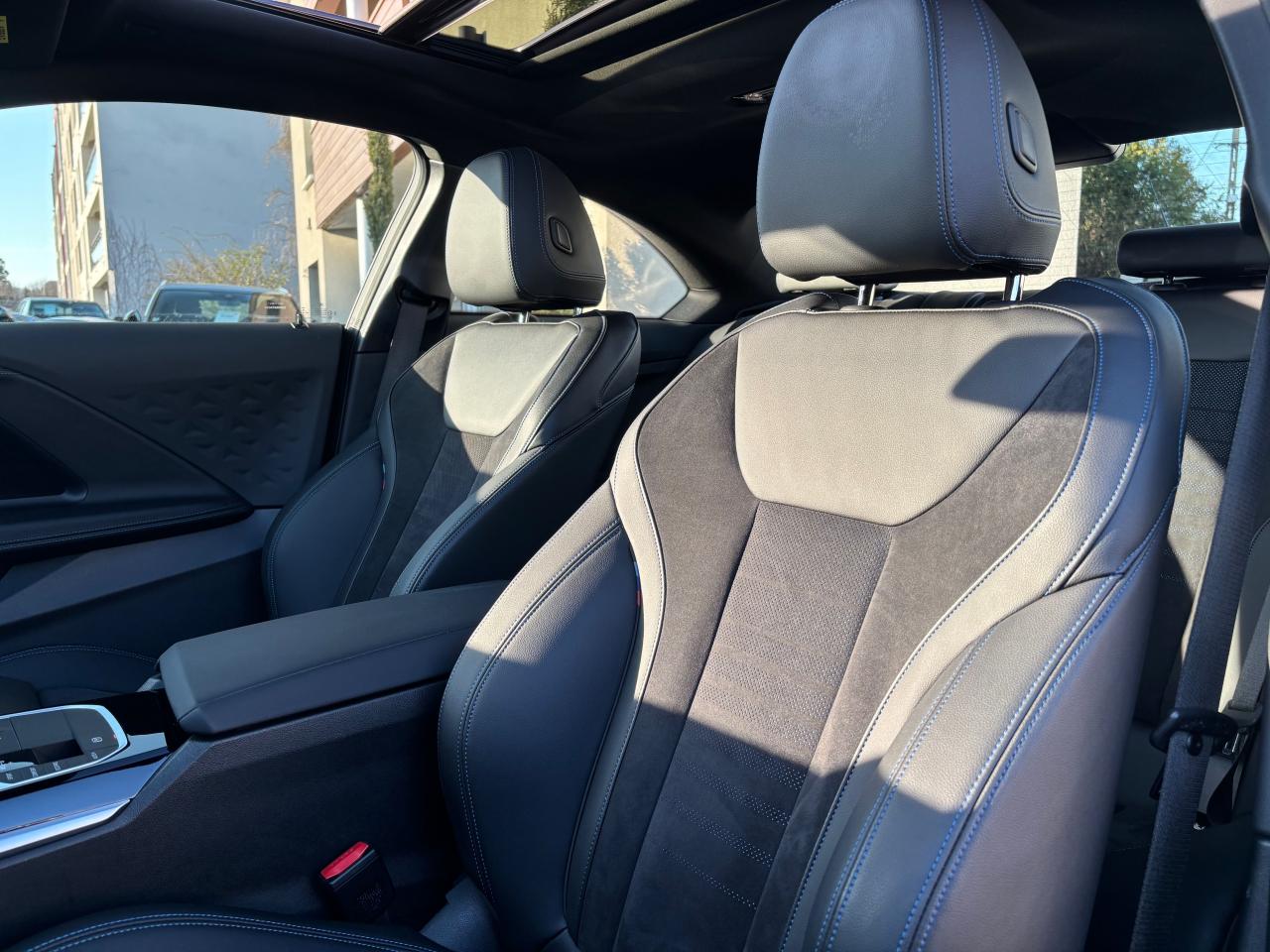 Parmi les équipements notables la sellerie Alcantara/Sensatec, le volant M gainé cuir Walknappa, la boîte automatique sport 8 rapports avec palettes, le différentiel autobloquant M Sport, la suspension DirectDrive M Sport, les freins M Sport, le toit ouvrant en verre, la climatisation automatique tri‑zone, l’aide au stationnement avant et arrière, les feux bi‑LED, les feux arrière à défilement LED et les réglages d’éclairage d’ambiance.