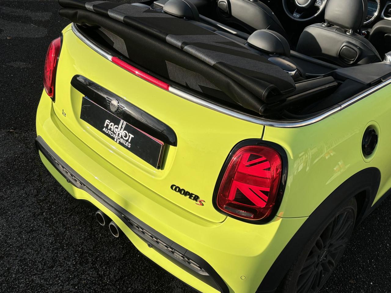 - Capote « Mini Yours » à motif Union Jack et projecteurs Full LED, soulignant le caractère Cabriolet et l'identité visuelle MINI.