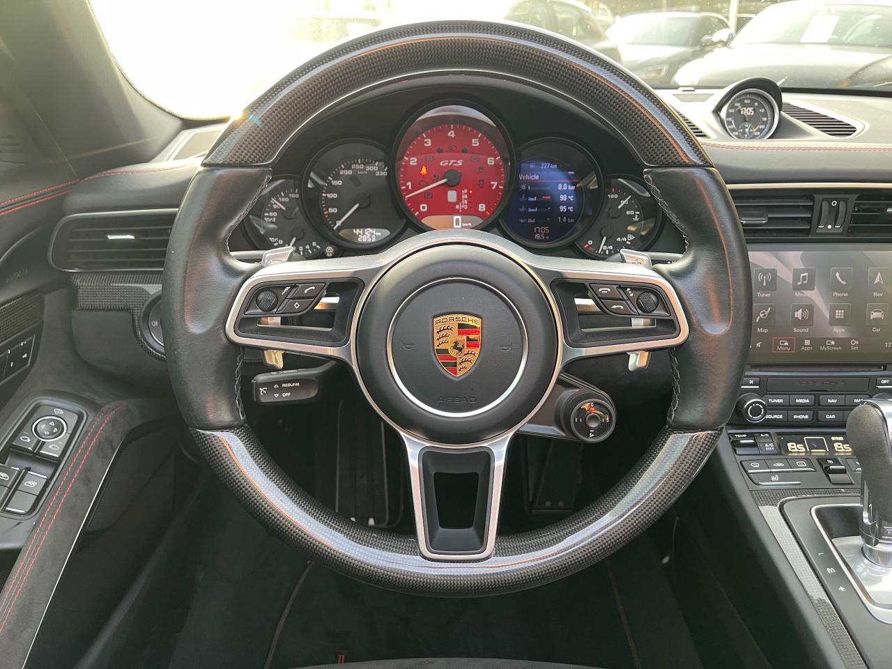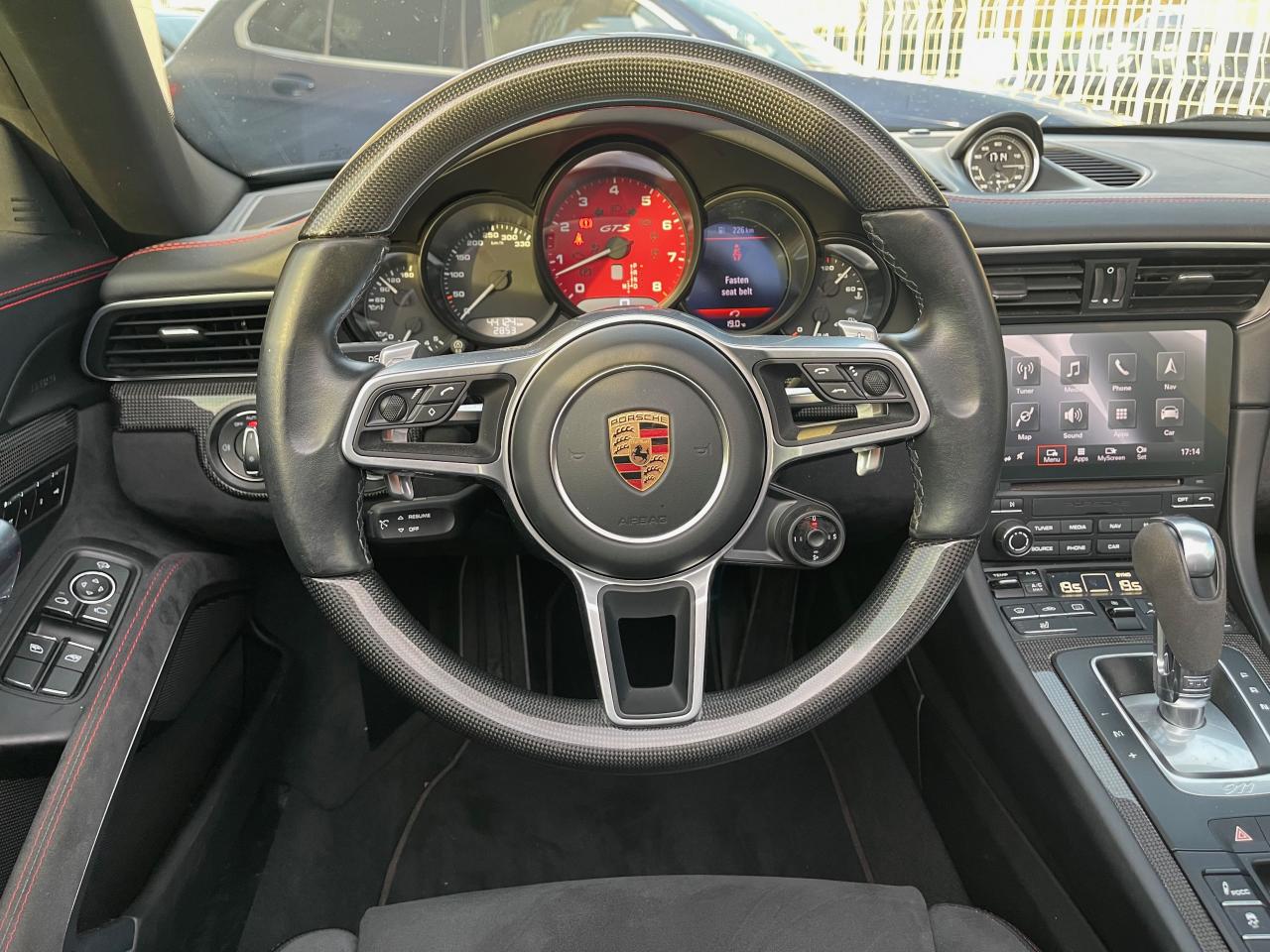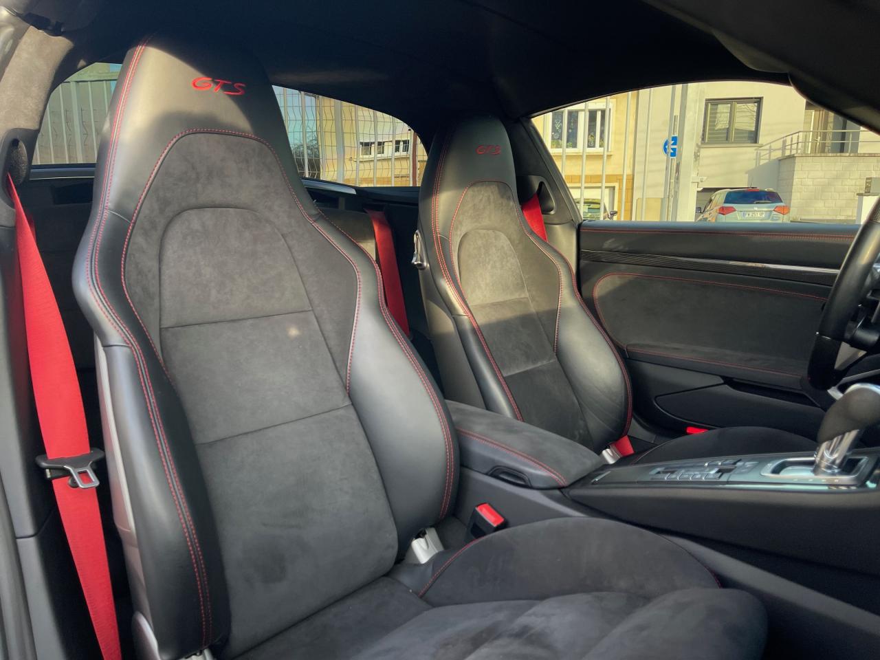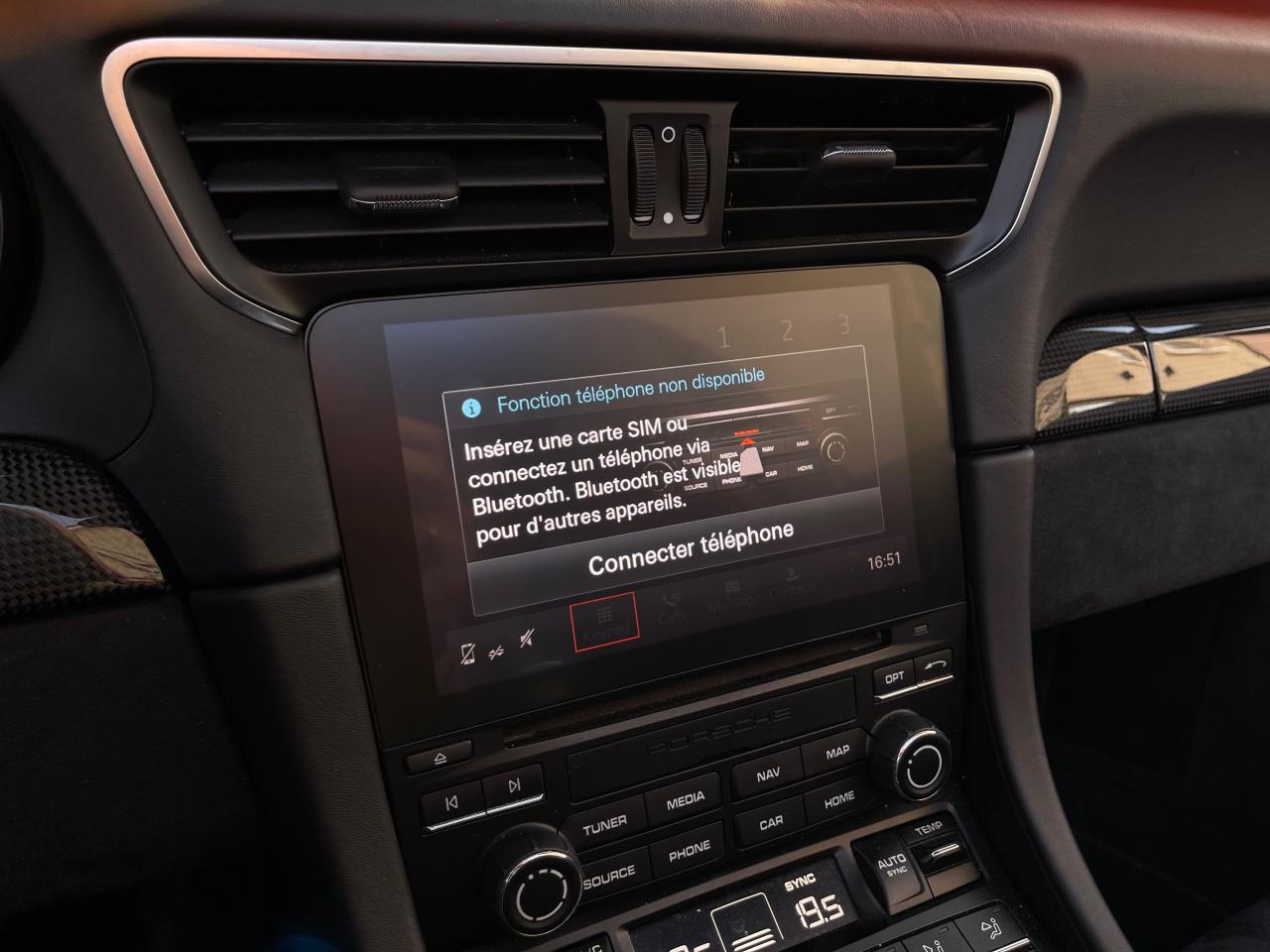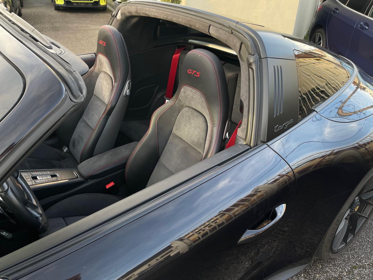 2 turbos, 2 échangeurs air/air3 Prises 12 V (plancher passager, boîte à gants, coffre de rangement de la console centrale)4 soupapes par cylindre5 instruments ronds intégrés dans le cockpitAffichage analogique : régime, vitesse, pression et température de l'huile, température du liquide de refroidissement et jauge de carburantAffichage de la vitesse engagée sur le compte-toursAileron arrière à déploiement automatiqueAirbags grand volume (deux niveaux de gonflage) pour le conducteur et le passagerApplication Connect, Navigation avec information trafic en temps réel, visualisation avec Google Earth et Google Street ViewAppuie-tête intégrés aux sièges avant avec inscription « GTS » brodée en NoirArceau Targa fixe avec baguette en Aluminium peinte en Noir, ouïes et inscription « targa » de couleur NoirAssistance au démarrageAssistance automatique à l'utilisation des feux de croisement comprenant l'éclairage d'accompagnementBaguettes de seuil de porte avec monogrammeBandes centrales et latérales des sièges avant et appuie-tête en cuir estampéBloc moteur et culasse en aluminiumBlocs optiques additionnels séparés, intégrés dans le bouclier avant, incluant les feux de jour et de position ainsi que les clignotants à diodes électroluminescentesBoîte à gants grand volume verrouillableBoîte de vitesse Porsche Doppelkupplung (PDK)Bouclier avant SportDesign avec lèvre de spoiler noireBoucliers avant et arrière déformables, avec pare-chocs intégrés (en alliage léger) fixés sur des absorbeurs de chocsCapot de coffre à bagages, ailes avant, portières et capot arrière en aluminiumCeintures de sécurité à 3 points à l'avant et à l'arrière, boucles de ceintures sur les siègesCiel de toit et montant de lunette arrière en alcantaraClimatisation automatique 2 zones avec réglage individuel de la température pour le conducteur et le passager, commande automatique du recyclage de l'air avec capteur de qualité d'airCommande vocaleCompensation hydraulique du jeu des soupapesConception allégée intelligente acier/aluminiumConsole centrale montante avec barrettes de commandes, vide-poches et coffre de rangement fermé comportant une prise 12 VContrôle de pression des pneus ( TPMS )Coque des dossiers peinte en GrisCouronne du volant, leviers de vitesse et de frein à main, poignées de porte, accoudoirs et coffre de rangement de la console centrale en cuir lisseCrochets porte-vêtement au dos des sièges avant et sur les montants latérauxDeux catalyseurs à 3 voiesDiamètre des disques de frein 350 mm à l'avant, 330 mm à l'arrièreDirection assistée électromécanique à démultiplication variable et impulsionDispositif antidémarrage avec verrouillage centralisé et télécommande, dispositif de sécurité, système d'alarme et alarme volumétriqueDispositif de contrôle de l'usure des freins sur chaque plaquetteDisques ventilés et ajourés à l'avant et à l'arrièreÉléments en Argent galvanisé : buses d'aération, baguettes décoratives du tableau de bord, cache de la console centrale, poignée de la boîte à gants, poignées et baguettes de parement des portesEssieu arrière multibras avec barres stabilisatricesEssieu avant avec jambes de force McPherson et barres stabilisatricesEtriers de frein rougesÉtriers fixes monobloc en aluminium à 6 pistons à l'avant et 4 pistons à l'arrièreFeux arrière comprenant les feux de recul et les clignotants, le feu antibrouillard arrière ainsi que le troisième feu stop et l'éclairage de la plaque minéralogique à diodes électroluminescentesFiltres à particules et à pollen avec filtre à charbon actifFonction Stop-Start automatiqueFonds de compteur (compte-tours compris) et inscription « GTS » en NoirFrein de parking électriqueInjection directe d'essence (Direct Fuel Injection, DFI)Inscription décorative « GTS » sur les portes gauche et droite en NoirJantes « 911 Turbo S » 20 pouces en alliage léger forgé, avec fixation centrale, en Noir (finition satinée)Kit de réparation des pneus avec compresseur électriqueLubrification intégrée à carter secModule Connect Plus Apple CarPlay, rangement pour smartphone, Hotspot Wi-Fi, Porsche Car Connect avec Services de contrôle à distance, module de téléphone LTEPack Audio PlusPack Sport Chrono avec sélecteur de mode et application Porsche Track PrecisionPhares Bi-Xénon avec réglage dynamique de la portée d'éclairage et lave-phares avec gicleurs en Noir finition satinéePlaquette portant l'inscription Carrera devant le levier de vitessePompe à huile à régulation électroniquePorsche Active Suspension Management (PASM) avec abaissement du châssis de 10 mmPorsche Communication Management (PCM) avec module de navigationPorsche Side Impact Protection System (POSIP) comprenant : protection anti-encastrement latérale dans les portes,airbags thorax intégrés dans les bandes extérieures des sièges avant et airbags de tête intégrés dans les contre-portes pour le condPré-équipement pour l'installation en seconde monte du dispositif ISOFIX/Top-Tether destiné à fixer le siège enfant sur le siège passager avantPré-équipement pour téléphone mobilePrétensionneurs de ceinture à l'avantRangement supplémentaire derrière les sièges arrièreRefroidissement par eau, avec gestion thermique du moteur et de la boîte de vitesseRétroviseurs extérieurs SportDesign sur panneau de porte, chauffants et à réglage électrique, base de couleur Noir satinéeServices Porsche Vehicle Tracking System (PVTS) permet l'accès aux services de commande liés au véhicule, à travers les services Porsche Car ConnectSièges arrière rabattables individuellementSièges électriques - 4 positionsSièges sport Plus avec bandes latérales rehaussées, réglages électriques pour le dossier et la hauteur dassise, et réglage mécanique de l'avancée du siègeSignature « PORSCHE » et monogramme sur le bouclier arrière en NoirSpots de lecture, éclairage 