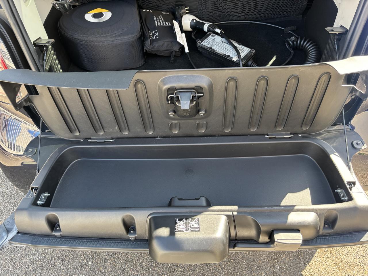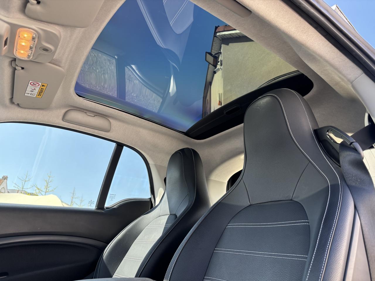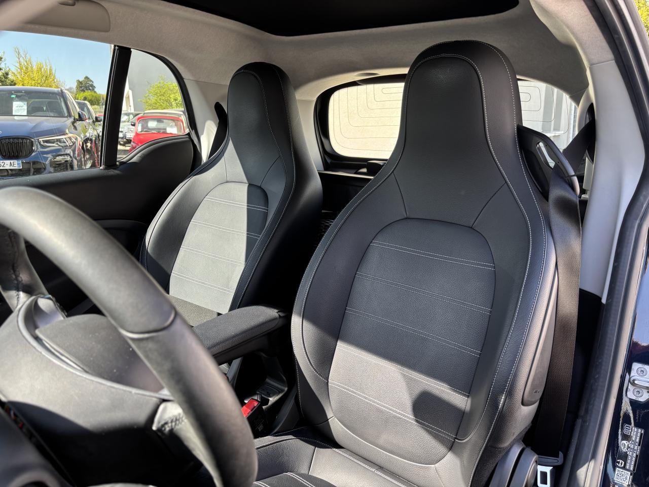 2 ports USB de type A, 1 connexion AUXAccoudoir central avant rabattableAffichage de la température extérieure, avertisseur de verglasAide au démarrage en côteAide au stationnement arrière avec alerte sonore (trois capteurs à ultrasons situés à l'arrière)Airbag genoux conducteurAirbags latéraux tête-thorax pour conducteur et passager avantAirbags pour conducteur et passager avant avec désactivation d'airbag passager avantAntenne de toitAvertisseur d'oubli de ceintures de sécurité conducteur et passagerAvertisseur sonore pour piétonsBoîte à gants verrouillableBoîte de vitesses automatique à 1 rapportCache de maintenance verrouillable (sous le châssis)Cache-bagages à enrouleur (avec filet de rangement)Caméra de reculCapteur de collision activant les feux de détresseCeintures de sécurité 3 points avec prétensionneurs et limiteurs d'effortCellule de sécurité tridion noirChargeur embarqué de 4,6 kWClé pliante à trois touches permettant de verrouiller/déverrouiller les portes et le hayon, deuxième clé à panneton fixeClignotants à commande confort par impulsionsClignotants latéraux blancsColonne de direction réglable en hauteurCombiné d'instruments avec visuel TFT couleur de 8,9 cm (3,5") et ordinateur de bordCompartiment de rangement dans le hayon arrièreCompartiment de rangement dans les portes avantConsole centrale avec cache coulissant, vide-poches et double porte-gobeletsContrôle de pression des pneus ( TPMS )Coques de rétroviseurs extérieurs dans le coloris de la cellule de sécurité tridionCorrecteur de portée des phares (commande manuelle)Direction assistée électriqueDossiers des sièges conducteur et passager avant réglables d’un seul gesteDrive lock - système automatique de fermeture des portes au démarrageEclairage d'ambianceEclairage du coffreEclairage intérieurESP - régulation de comportement dynamiqueEssuie-glace arrière à cadencement et fonction de lavage/balayage automatiqueEssuie-glace confort à cadencement et fonction de lavage/balayage automatiqueFilet de rangement sur la console centrale côté passagerFixations de siège enfant i-Size sur le siège passager avant avec désactivation manuelle de l'airbagFreinage d'urgence assisté actifGarnitures en cuir noir avec surpiqûres grises, planche de bord et partie centrale des contre-portes en tissu noir et pièces personnalisées en noirGrille de calandre couleur carrosserieHaut-parleurs, à l'avantInstrument complémentaire avec affichage de la puissance et du niveau de charge de la batterieIntégration smartphoneJantes en alliage léger 41 cm (16") à 8 branches en Y, finition noir/naturel brillant avec pneus avant 185/50 R16 et arrière 205/45 R16Kit de dépannage : compresseur 12 volts et produit d'étanchéité de pneuLève-vitres électrique à commande confort et protection antipincementLunette arrière dégivranteMiroirs de courtoisie à l'avantPack de câbles de rechargePanneaux de carrosserie noir non métalliséPare-soleil avec porte-ticketPhares LED intégraux hautes performances avec projecteurs antibrouillardPneus étéPoches aumônières au dos des sièges conducteur et passager avantPochette pour câbles de chargePoignées de portes intérieures d'aspect chromé matPoignées de portes intérieures noiresPommeau de levier de vitesses cuir noirPrise 12 volts avec cachePush to talk : active la reconnaissance vocale du smartphoneRainsensor (Capteur de pluie et de luminosité)Réception radio numérique : réception des signaux DAB, DAB+ et DMB audioRégulateur et limiteur de vitesseRétroviseur extérieur à miroir bombé asphérique du côté conducteurRétroviseur intérieur électrochromeRétroviseurs extérieurs électriques et dégivrantsSangle pour la fixation d’objet sur le siège passagerSiège conducteur réglable en hauteurSiège passager avec fonction de chargement en longueur (dossier entièrement rabattable)Sièges avant chauffantsSmart EQ control (3 ans d'abonnement inclus à compter de l'activation)Spots de lecture AVSystème antiblocage des roues (abs) avec répartiteur électronique de freinageSystème Bluetooth (téléphone et musique)Système de stabilisation en cas de vent latéralSystème multimédia smart avec visuel Multi-Touch de 20,2 cm (8")Tapis de sol en velours noirToit panoramique avec pare-soleilTriangle de présignalisation avec kit de premiers secoursTroisième feu de stop à LEDVerrouillage centralisé avec télécommande radio, témoin optique de fermeture et antidémarrageVolant multifonction à 3 branches en cuir, avec barrette dans le ton anthracite et surpiqûres grises